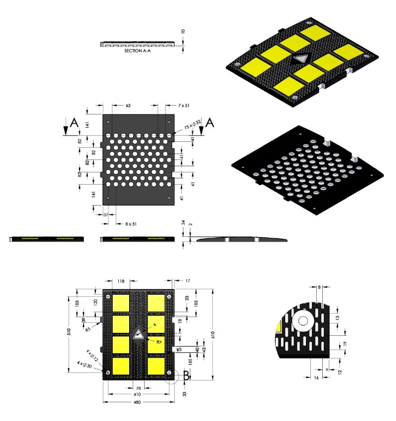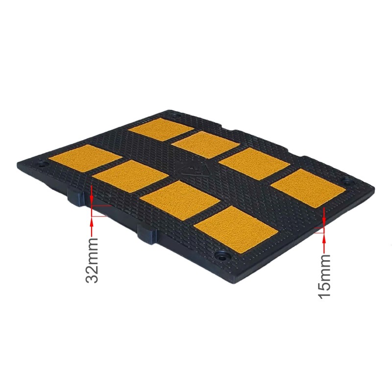 Eίναι κατασκευασμένα από σκληρό καουτσούκ. Για αυτόν τον λόγο αποτελούν φιλικότερη λύση προς τα οχήματα σε σχέση με αντίστοιχους από μπετόν ή άλλα υλικά. Επιπρόσθετα παρουσιάζουν και καλύτερη πρόσφυση με το έδαφος σε σχέση με άλλα υλικά. Οι μειωτήρες ταχύτητας είναι διακριτοί ακόμα και σε συνθήκες χαμηλού φωτισμού χάρη στα έντονα χρώματά τους ή/και στις ανακλαστικές τους ταινίες ή/και στα μάτια γάτας που διαθέτουν, ανάλογα με το μοντέλο τους. Μπορούν να τοποθετηθούν μόνιμα ή προσωρινά, ενώ διαθέτουν ακριανά κομμάτια για όμορφο αισθητικά αποτέλεσμα και μεγαλύτερη ασφάλεια.