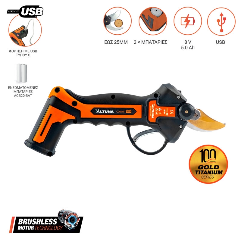 Ψαλίδι κλαδέματος μπαταρίας Altuna 8V ACB25 - 2 x μπαταρίες λιθίου 8V -5.0 Ah